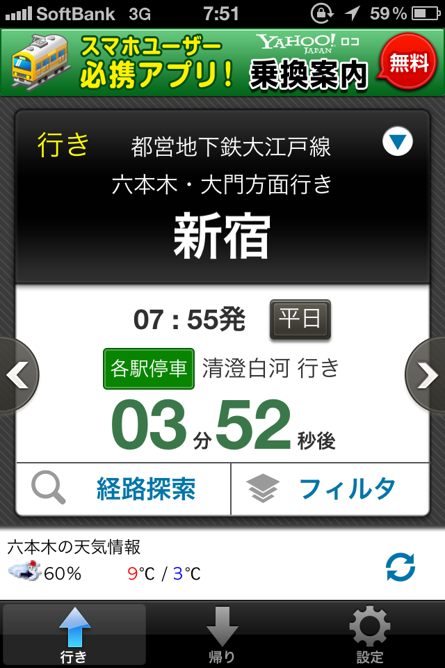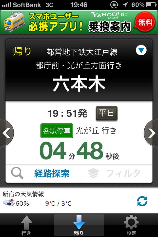 自宅や職場・学校の最寄り駅からの電車の発車時刻をカウントダウン表示するアプリ。レビューはこちら。